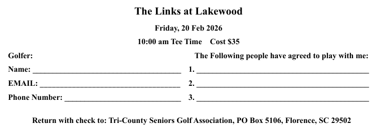 Next Tournament Friday, 20 Feb 2026 at the Links of Lakewood, Sumter SC. Tee time will be at 10 AM