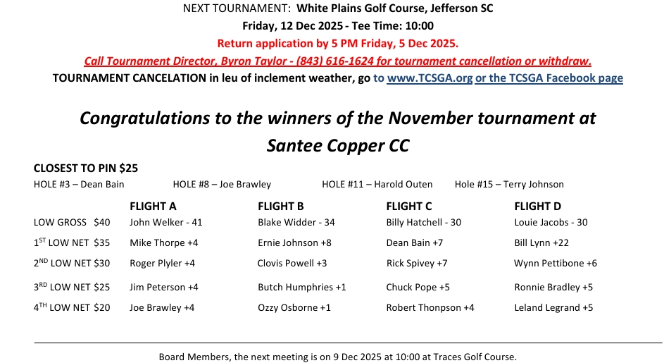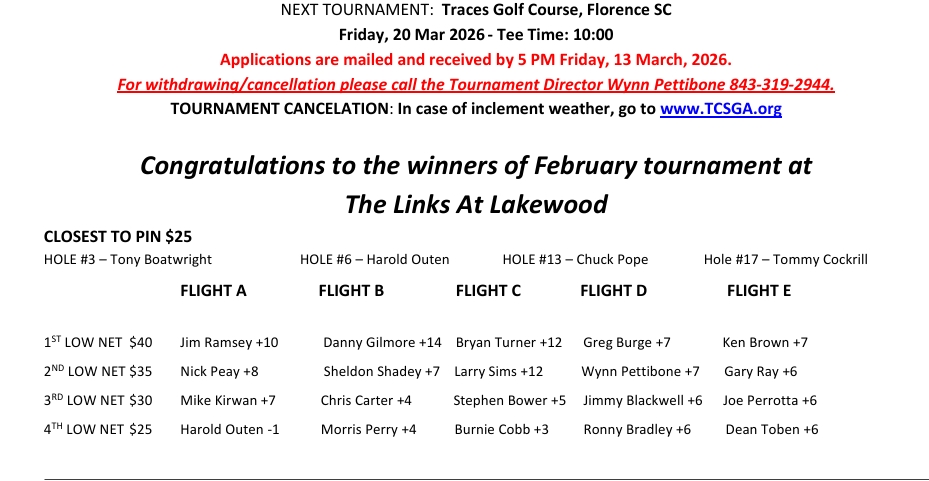 All winnings are given out the day of the tournament. If you leave the course without claiming your winnings, it is your responsibility to check with the treasurer within 3 months to collect them or they will be forfeited.
